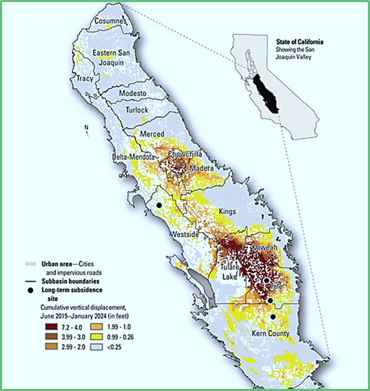 “However, expansions of agricultural acreage and drought periods between 2000 and 2023 coincided with reduced surface water availability [emphasis added], resulting in increased groundwater pumping, which resulted in accelerated subsidence rates of more than 1.0 ft/year in parts of the San Joaquin Valley and more than 0.5 ft/year in parts of the Sacramento Valley.”