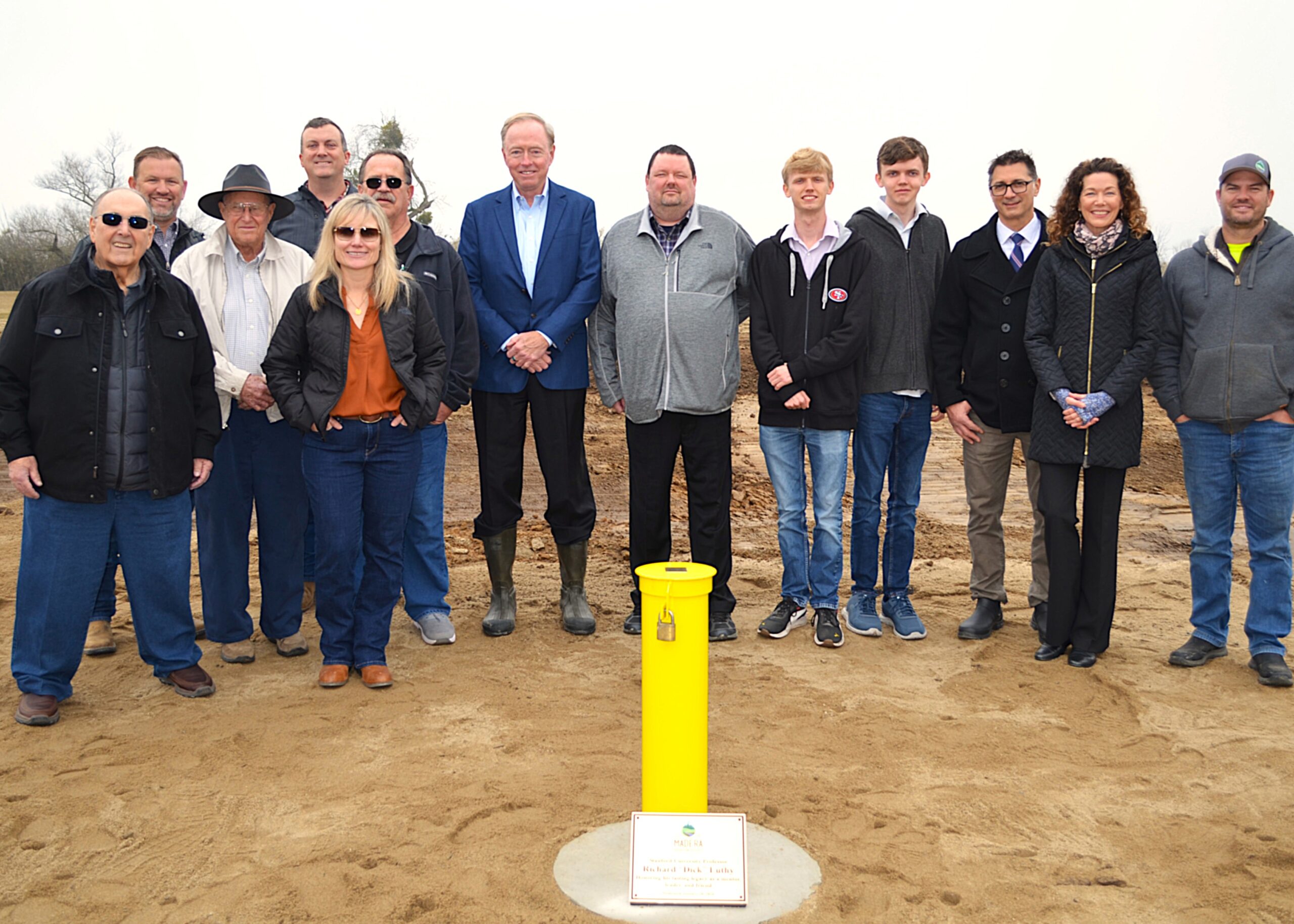 Prior to the meeting of the board of directors of the Madera Irrigation District on January 20, 2026, a short ceremony was held to honor the work of the late Dr. Richard Luthy, professor and nationally prominent water engineer from Stanford University. Along with his colleagues and students, he had been working with the district to monitor the impact of recharge basins on groundwater quantity and quality. He had passed away unexpectedly and the district recognized him for this project, which will continue. Shown are MID leaders with Dr. Luthy’s family members. In the foreground is one of the test wells used in the research showing the plaque itself.