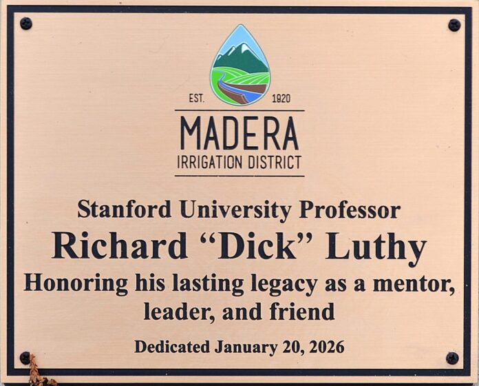 On January 20, prior to the regular meeting of the Madera Irrigation District board of directors, a short ceremony was conducted dedicating a plaque in memoriam of Dr. Richard “Dick” Luthy, noted Stanford University professor and water engineer who had been researching recharge flows for both water quantity and quality. He had passed away suddenly but the work will continue. The plaque is installed at recharge basin #10 where three test wells had recently been drilled at depths of 30, 60 and 100 feet.