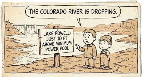 Metropolitan Water District reported that projected inflow to Lake Powell has dropped to about 5 million acre-feet (52% of average), with worsening hydrology driven by heat and dry conditions. The reservoir could fall below 3,500 feet later this year — approaching minimum power pool at 3,490 feet. Reclamation has already cut releases to Lake Mead, and basin states missed the February 14 deadline for a consensus framework on new operating guidelines. Read More