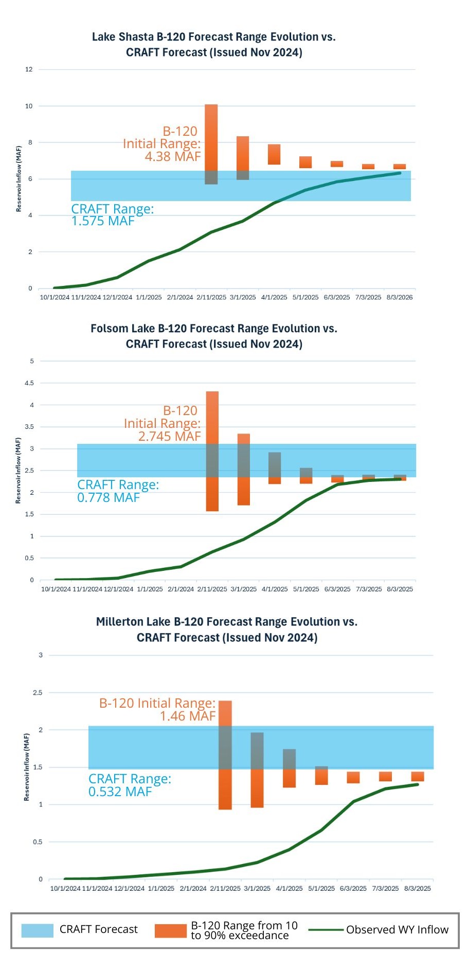 At Lake Shasta, CRAFT subscribers received a WY inflow forecast of 4.727–6.302 million acre-feet (MAF). In contrast, the initial B-120 forecast, delivered four months later, spanned 5.695–10.075 MAF—a range nearly three times bigger than CRAFT’s. As of August 3, 2025, WYTD observed inflow into Lake Shasta sits at 6.32 MAF.